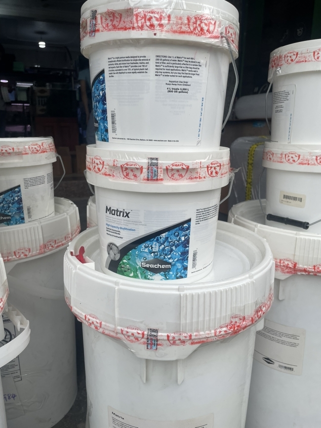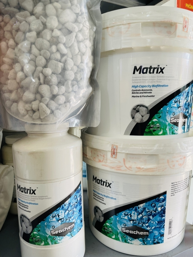 - Vi sinh cư trú bên ngoài bể mặt và bên trong hạt Matrix. Matrix là một loại vật liệu lọc sinh học có đỗ rỗng rất cao chứa vi sinh để loại bỏ các độc tố sinh ra từ chất thải của cá. Matrix là một chất rắn vô cơ xốp có đường kính khoảng 10mm. Mỗi một lít matrix cung cấp hơn 700m2 diện tích bể mặt tương đương 170l quả bóng nhựa bio, quả bóng nhựa chỉ cung cấp diện tích mặt bên ngoài trong khi matrix cung cấp cả bên ngoài và có các khoang trống bên trong. Những lỗ trống này có kích thước lý tưởng cho qua trình ô xi hóa các hợp chất chứa ni tơ và khử ni tơ của các vi sinh. Điều này làm cho Matrix không giống các loại vật liệu lọc khác, Matrix có thể đồng thời loại bỏ nitrat cùng với ammonia và nitrit cùng một lúc trong bộ lọc của bạn.